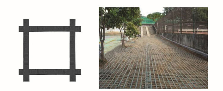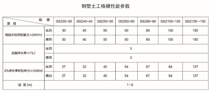 鋼塑復(fù)合土工格柵是用聚丙烯、聚氯乙烯等高分子聚合物經(jīng)熱塑或模壓而成的二維網(wǎng)格狀或具有一定高度的三維立體網(wǎng)格屏柵。由于塑料土工格柵在制造中聚合物的高分子會隨加熱延伸過程而重新排列定向,加強了分子鏈間的聯(lián)結(jié)力,達到了提高其強度的目的。其延伸率只有原板材的10%~15%。如果在土工格柵中加入炭黑等抗老化材料,可使其具有較好的耐酸、耐堿、耐腐蝕和抗老化等耐久性能。